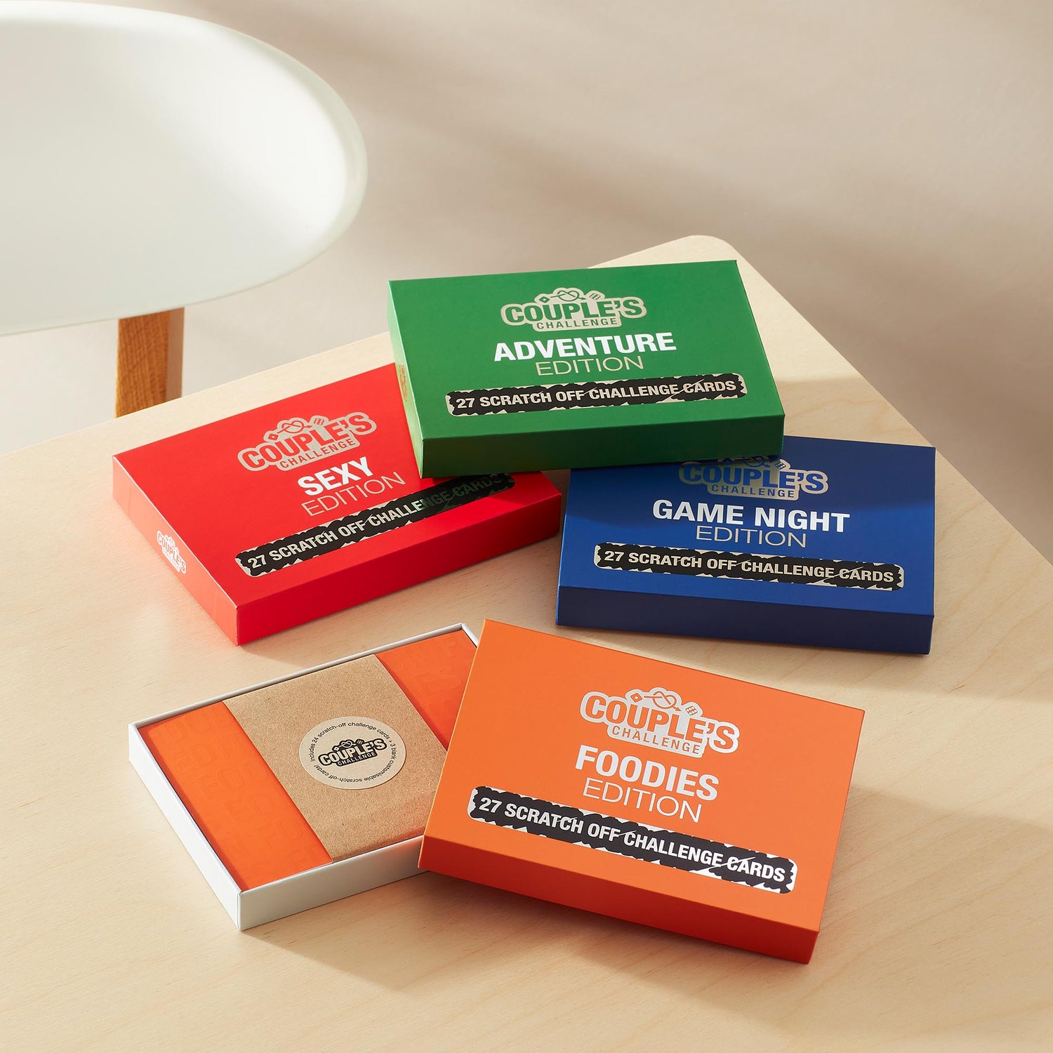Ignite fun and intimacy with our Couple's Challenge Packs, featuring 27 scratch-off cards per edition. Perfect for foodies, adventurers, game lovers, and those seeking to spice up their relationship!